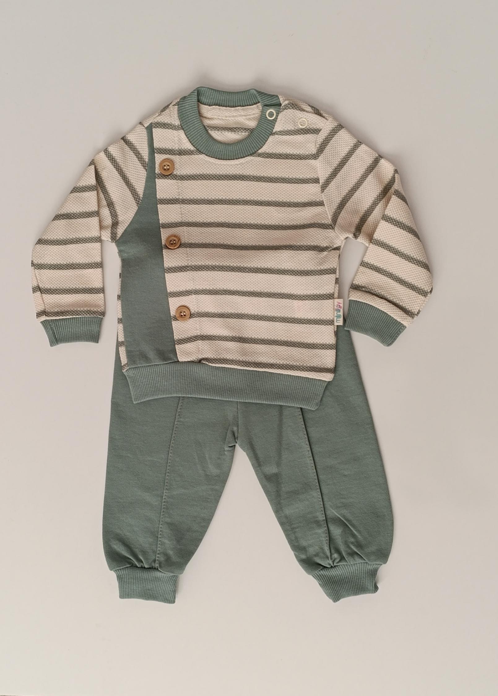 %100 pamuk kumaştan üretilmiştir. Erkek bebekler için özel tasarıma sahiptir. Çizgili ve düğme detaylı sweatshirt ile rahat kesim pantolondan oluşur. Terletmeyen, nefes alabilen yapıya sahiptir. Hassas bebek cildine uygundur. Günlük kullanıma uygundur. Esnek bel lastiği sayesinde kolay giydirilir.