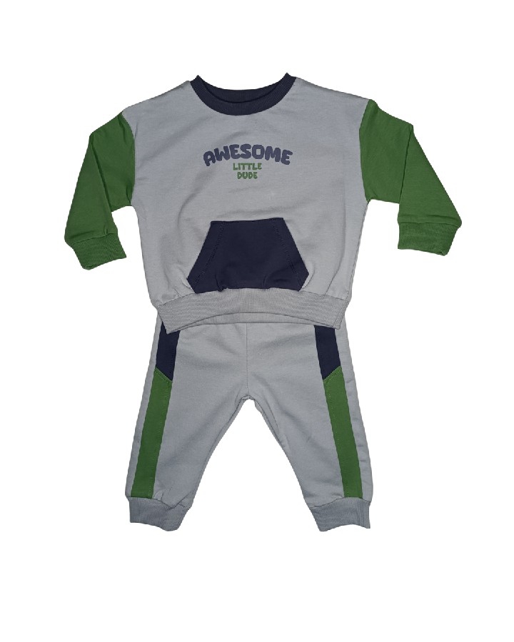 Ürün Açıklaması: Küçük beylerin enerjisine ayak uyduracak konfor! %95 pamuk kumaştan üretilen Awesome Little Dude Erkek Bebek Eşofman Takımı, hem rahatlığı hem de şık duruşuyla gün boyu özgür hareket imkânı sunar. Yumuşacık iç dokusu sayesinde bebeğinizin hassas cildini korur, nefes alabilen yapısı ile terletmez. Üst kısmındaki “Awesome Little Dude” baskısı ve renk bloklu tasarımıyla modern bir görünüm kazandırır. Alt kısmı esnek bel yapısı sayesinde kolay giyilir ve bebeğinizin hareketlerine uyum sağlar. 🧩 Ürün Özellikleri: %95 pamuk %5 likra kumaş OEKO-TEX® sertifikalı kumaş (zararlı madde içermez) Yumuşak ve esnek doku Nefes alabilir kumaş yapısı Renk bloklu modern tasarım Üst: Kanguru cepli sweatshirt Alt: Rahat kesim eşofman altı Beden Aralığı: 6 Ay – 24 Ay Türkiye’de üretilmiştir.