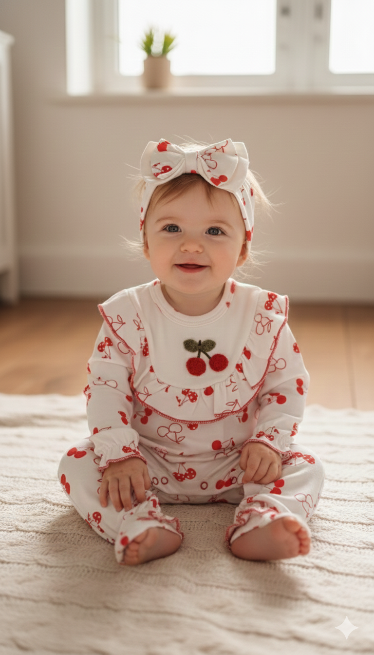 Kiraz Desenli Kız Bebek Tulum & Saç Bandı Seti – Fırfırlı Uzun Kollu %100 Pamuk