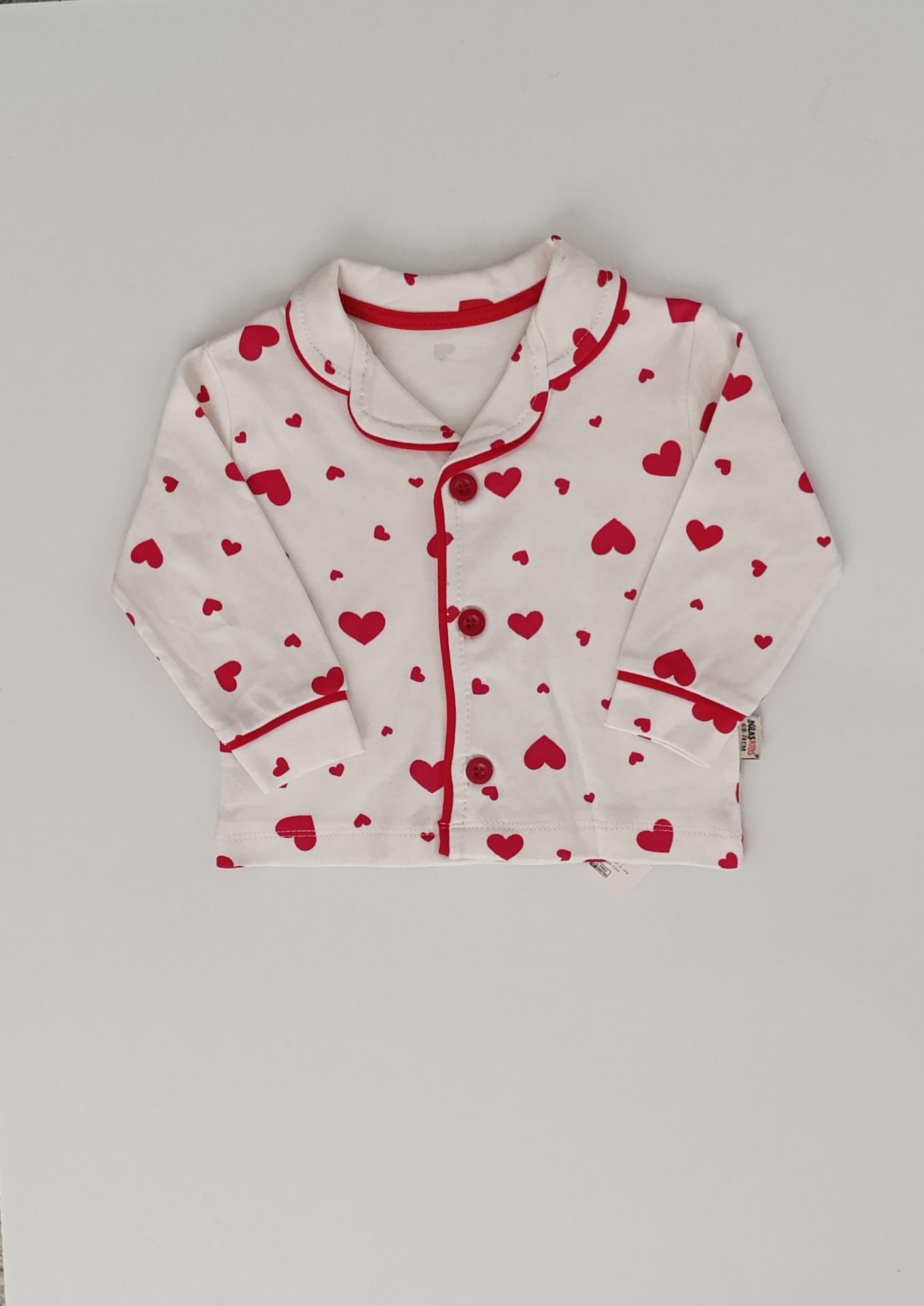 %100 pamuk kumaştan üretilmiştir. Kalp baskılı şirin tasarıma sahiptir. Uzun kollu üst ve rahat kesim pantolondan oluşur. Terletmeyen ve nefes alabilen yapıdadır. Hassas bebek cildine uygundur. Uyku ve günlük ev kullanımı için idealdir. Esnek bel lastiği sayesinde konforlu kullanım sunar.