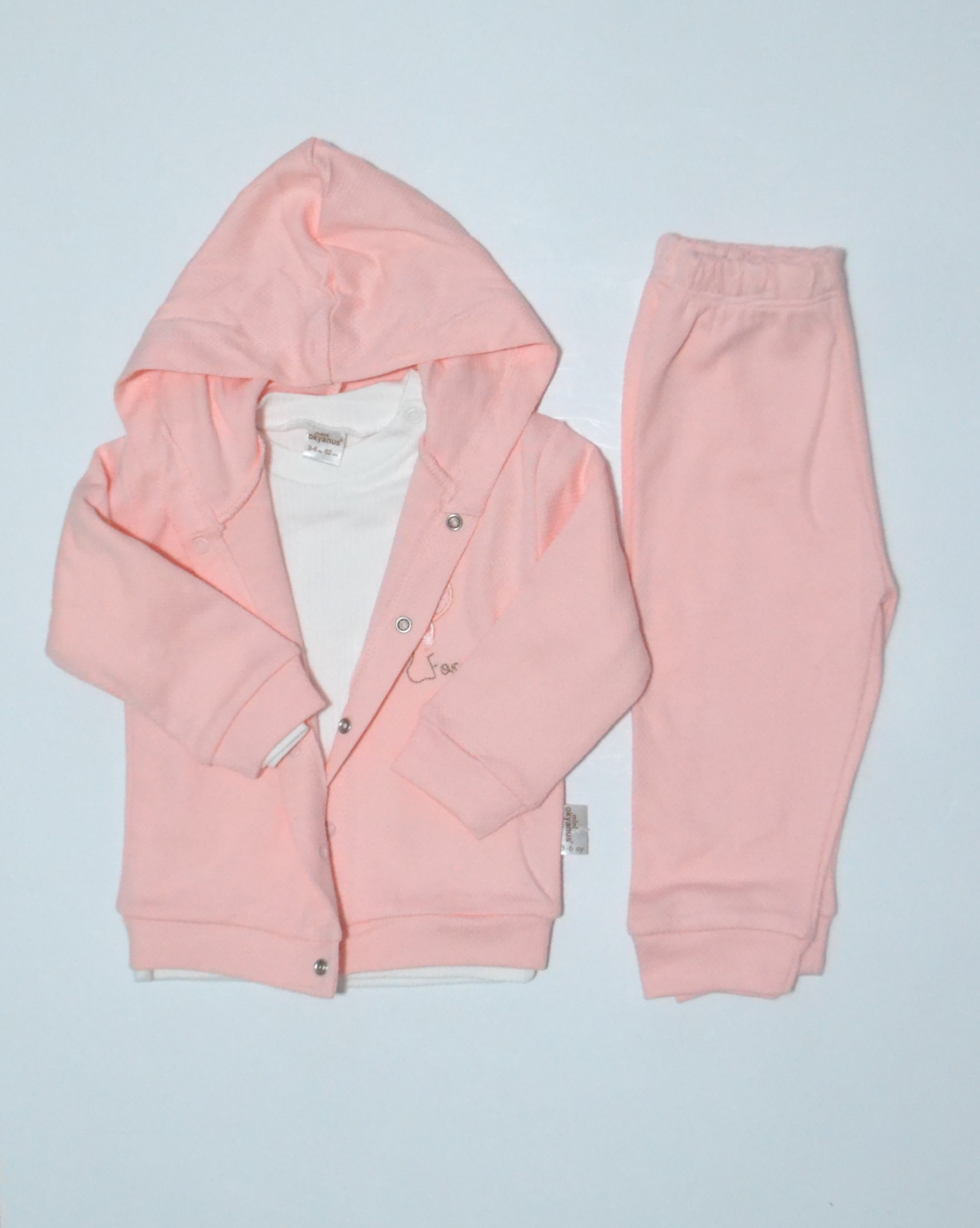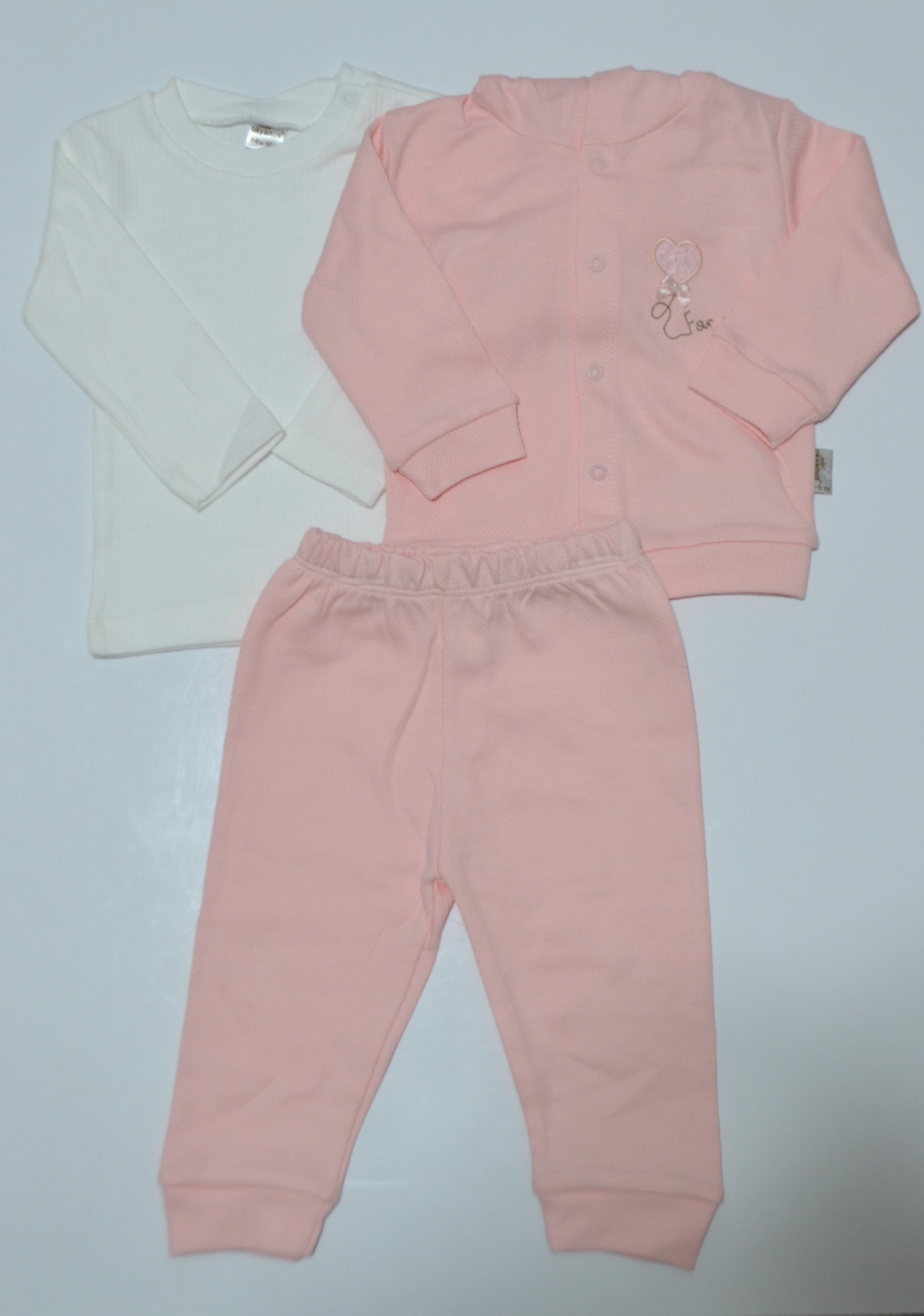 Bu şık ve konforlu 3’lü kız takım; yavruağzı hırka, uzun kol beyaz body ve uyumlu alt parçadan oluşur. Günlük kullanımda rahatlık, özel günlerde ise zarif bir görünüm sunar.